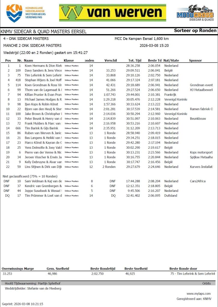 In de laatste ronde zorgde een foutje bij Tim Prümmer – Loet Van Der Putten ervoor dat Hermans – Rietman de leiding konden overnemen en uiteindelijk de reekszege pakten. Op de tweede plaats eindigden de sterk rijdende Davy Sanders – Jens Vincent. De broers Leferink, die als laatsten waren gestart, reden een indrukwekkende inhaalrace en kwamen als derde over de finish, vóór Stephan Wijers – Joel Hoffmann en opnieuw sterk rijdende Koen Grondman – Ross Vincent.