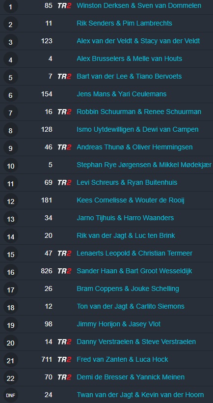 In de eerste reeks kregen we meteen een start-finishzege voor Tim en Sem Leferink, die een sterke en foutloze wedstrijd reden. De tweede plaats ging naar Koen Hermans – Dion Rietman. Verrassend sterk was de prestatie van Koen Grondman – Ross Vincent, die knap als derde eindigden, vóór Tim Prümmer – Loet Van Der Putten.